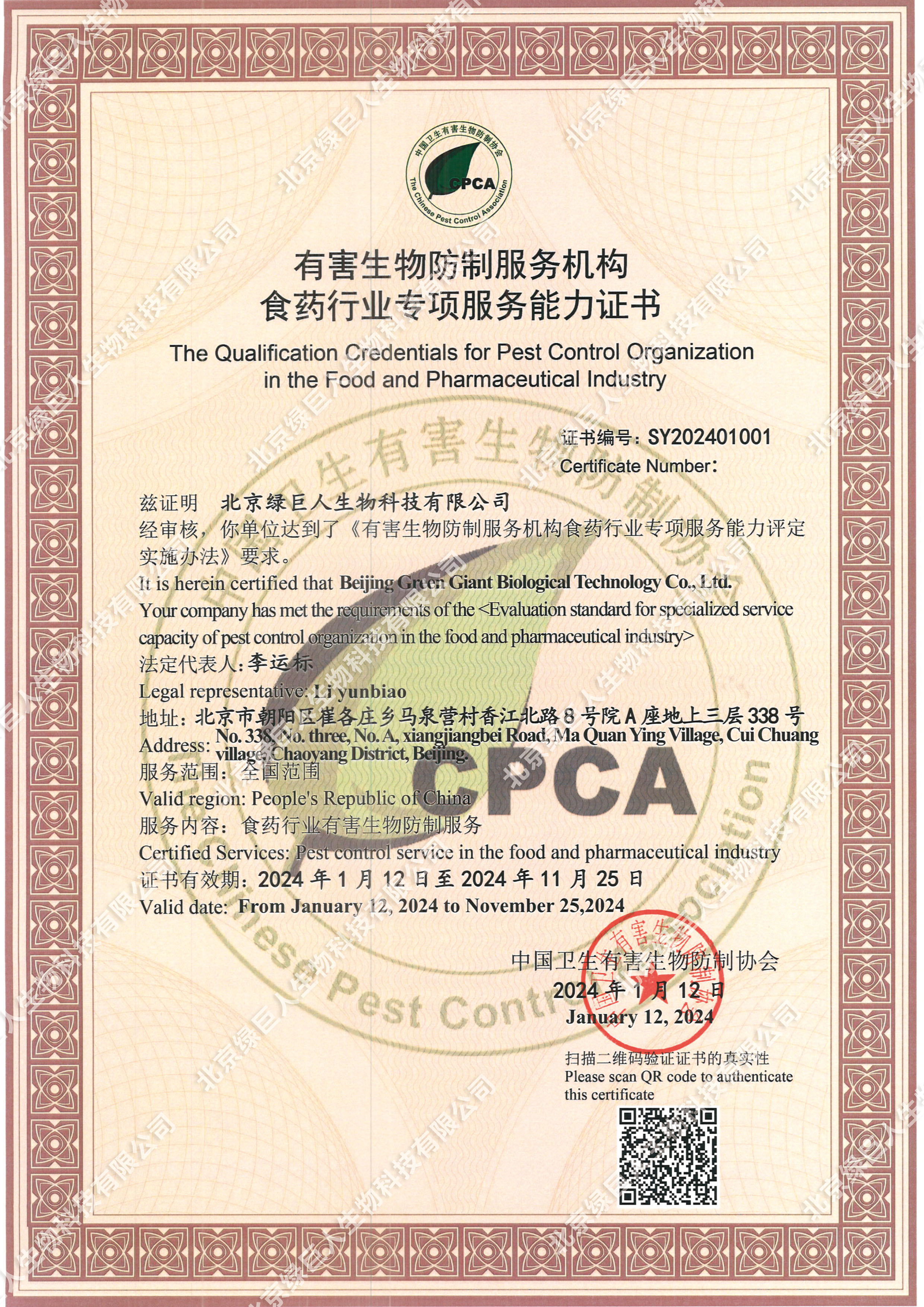 2024年1月12日,北京綠巨人生物科技有限公司獲得有害生物防制服務(wù)機構(gòu)食藥行業(yè)專項服務(wù)能力證書?!氨本┚G巨人”憑借13年食藥行業(yè)萬余家大、中、小企業(yè)服務(wù)案例,以及專業(yè)的服務(wù)經(jīng)驗和過硬得技術(shù)水平,通過了中國衛(wèi)生有害生物防制協(xié)會評審專家組一致肯定。